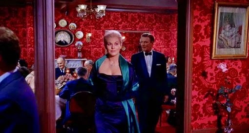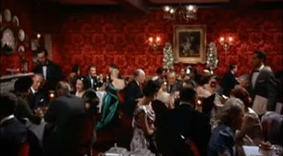 My favorite shot in the film is the long dolly shot that introduces Madeleine. The camera begins on Scottie, seated at the bar, looking over his right shoulder. The restaurant is full and noisy. The camera moves off him and tracks to the left until it comes to rest on a shot of the entire dining room. Then ever so slowly, like a dream, the sounds of the restaurant drop away and the score begins as the camera slowly tracks in towards Madeleine, with her back towards us. We know who we should be looking at because of the positioning of her body in the frame—she’s posed elegantly, like a painting. Her bare back is exposed, drawing our eye like a magnet. It’s not Scottie’s POV—instead it’s an objective shot that identifies the audience with Scottie. It’s as though Hitchcock is saying, “I want you, the audience, to become as fascinated with this woman as the protagonist is about to become.” For me, it’s masterful filmmaking. And it’s indicative of a mind that understands the power of the dynamics of montage–when to make the shot subjective, when to make the shot objective, and how the difference will affect the audience.